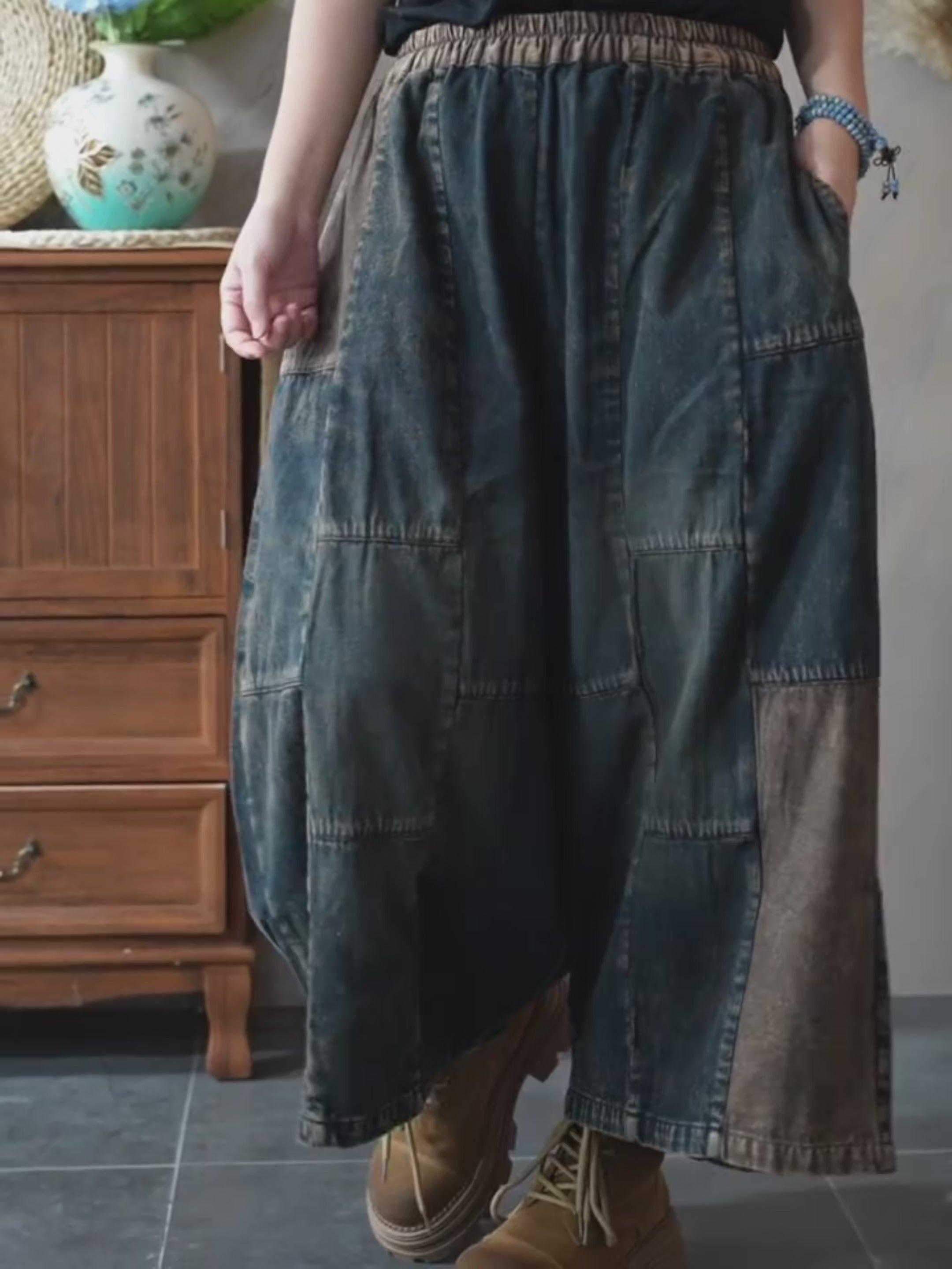 古着風 楽ちん 8分丈 とろみ 切替 デニムパンツ – Jojormaru